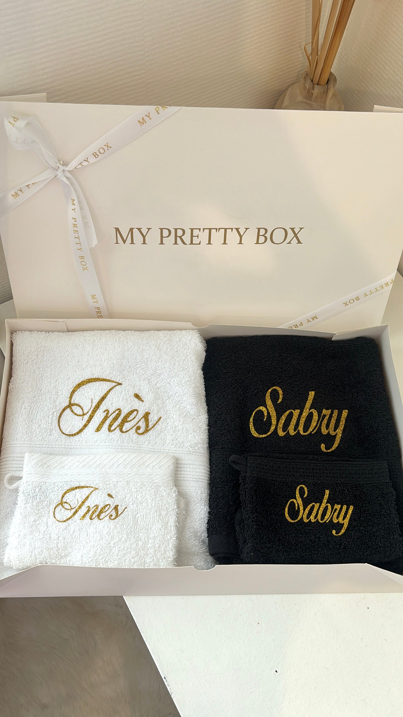 Ce coffret bain unique, composé de 2 serviettes et 2 gants personnalisés sont parfait pour une routine de soin agréable entre couple. Le coffret a été pensé pour les trousseaux de mariage ou un cadeau montrant un geste d'attention qui le quotidien chaleureux, à un prix accessible.